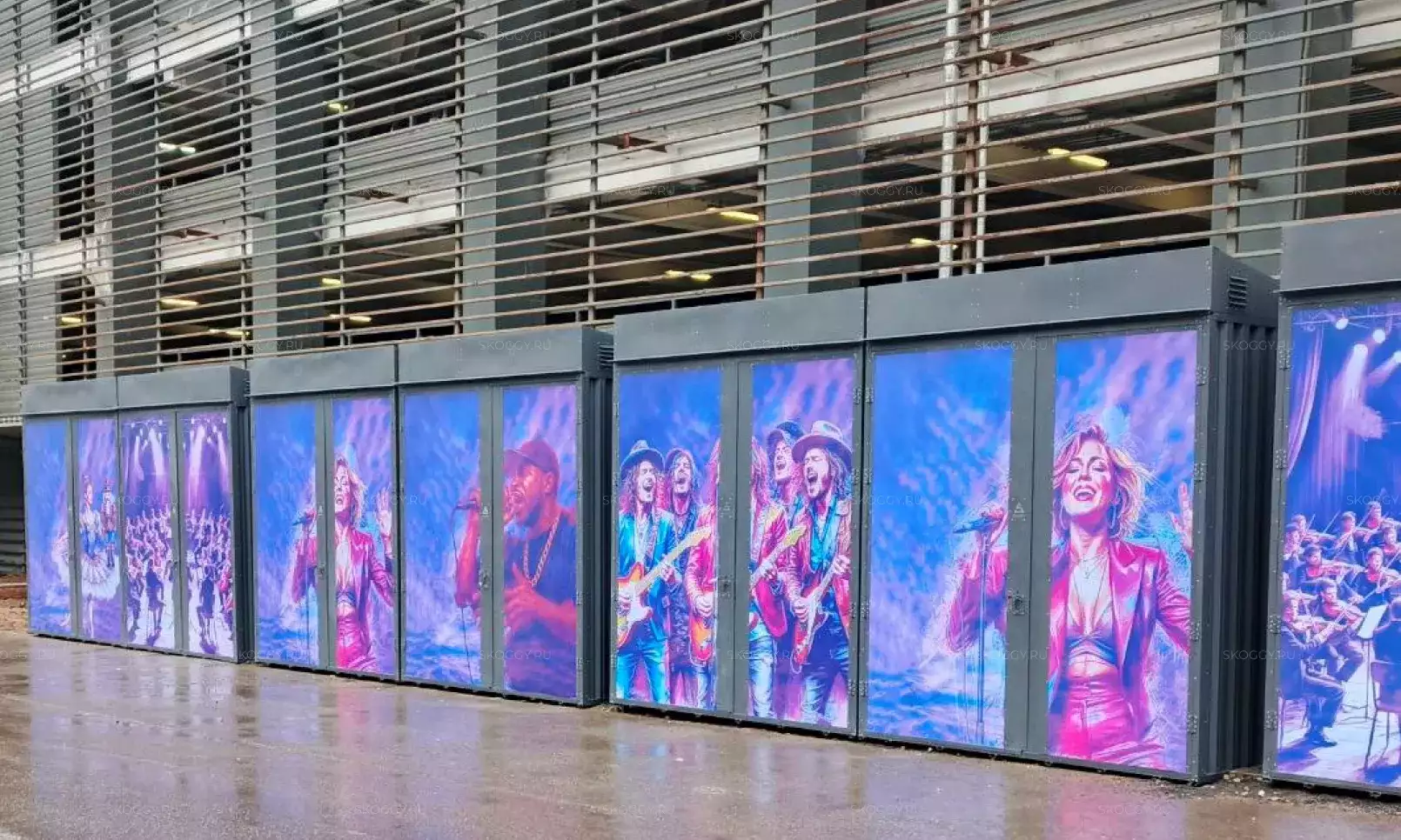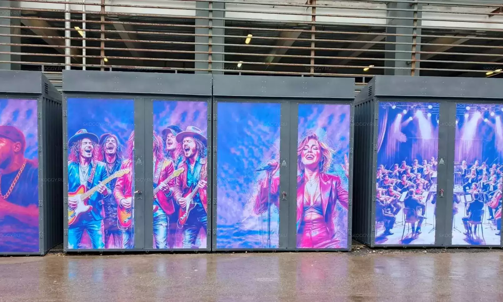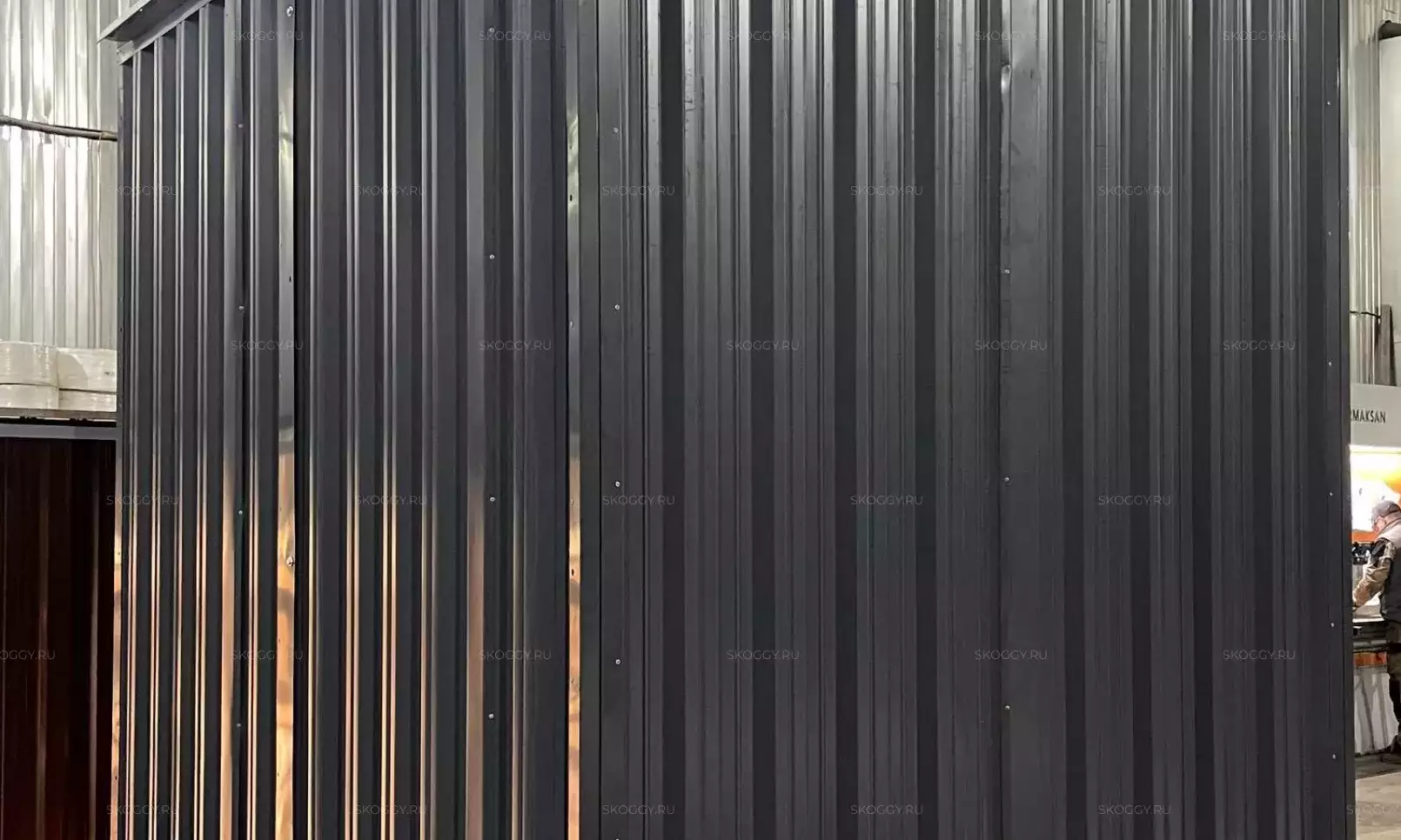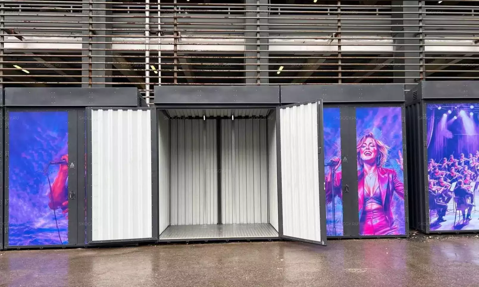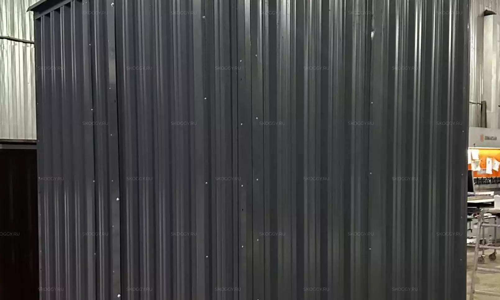 Нами были изготовлены две стандартные 5-метровые конструкции с плоской крышей и торцевой воротной группой в строгом графитовом цвете RAL 7024.