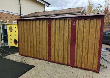Нами была изготовлена широкая 4-метровая конструкция с двускатной крышей и торцевой входной группой в необычном сочетании расцветок «под дерево» Дуб 3Д для основных элементов и винно-красного RAL 3005 для фасонных элементов, рольставней и крыши.