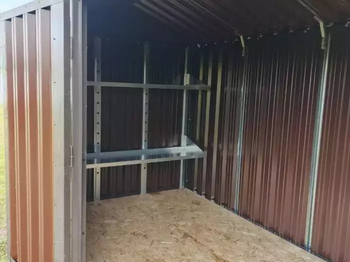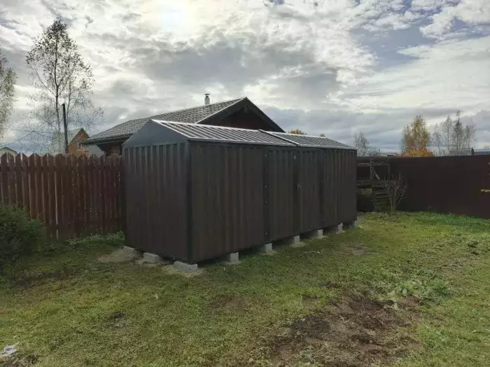 Нами была изготовлена конструкция размером 6 х 3 х 2,45 м с двускатной крышей и торцевой воротной группой в потрясающем сочетании расцветок RAL 1014 «слоновая кость» для основных элементов и благородного серо-коричневого RAL 8019 на фасонных элементов и крыши.