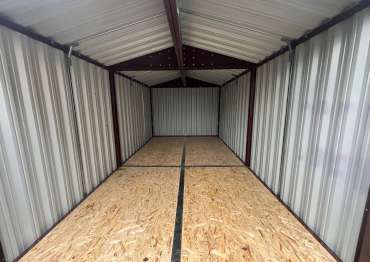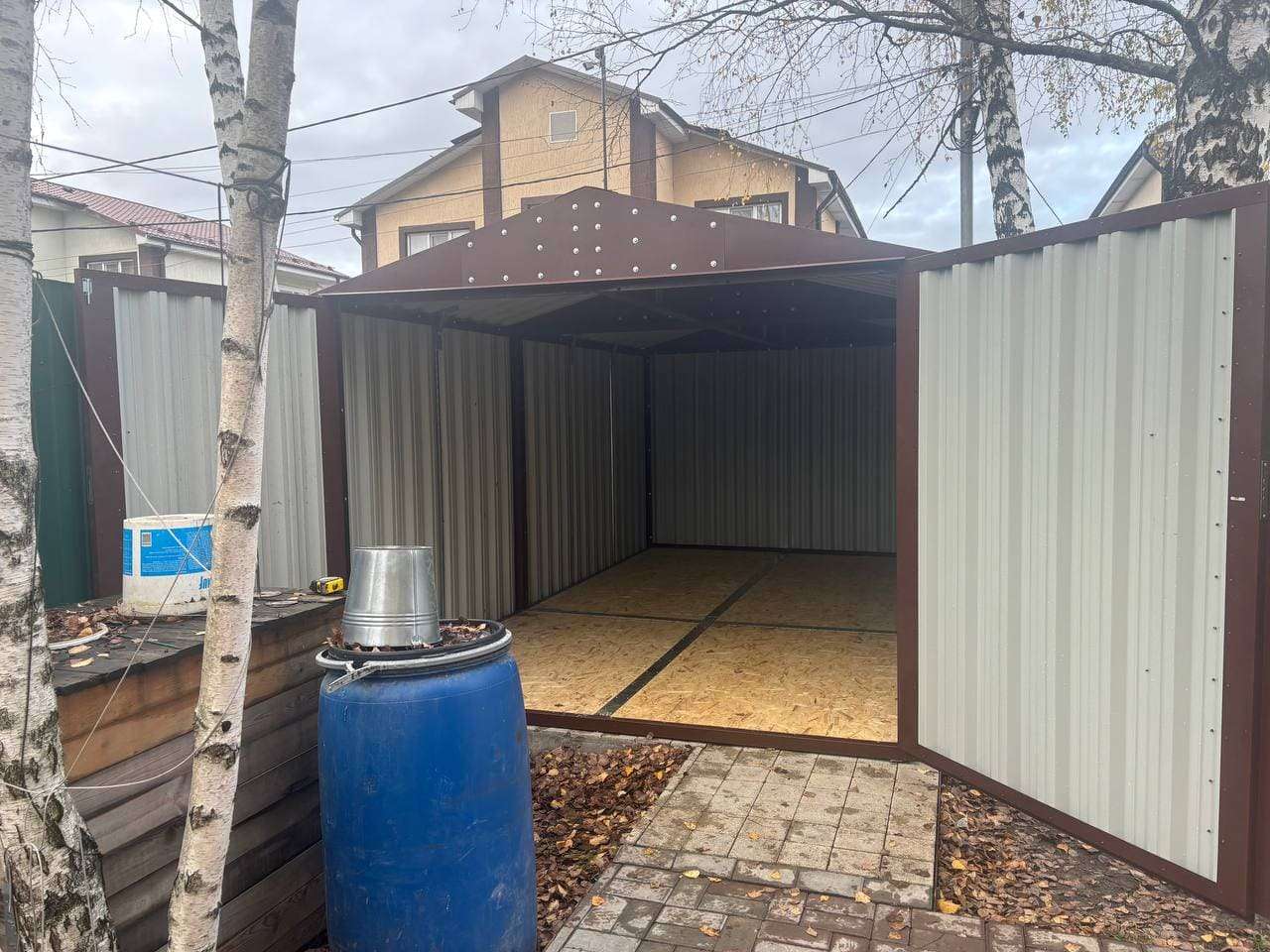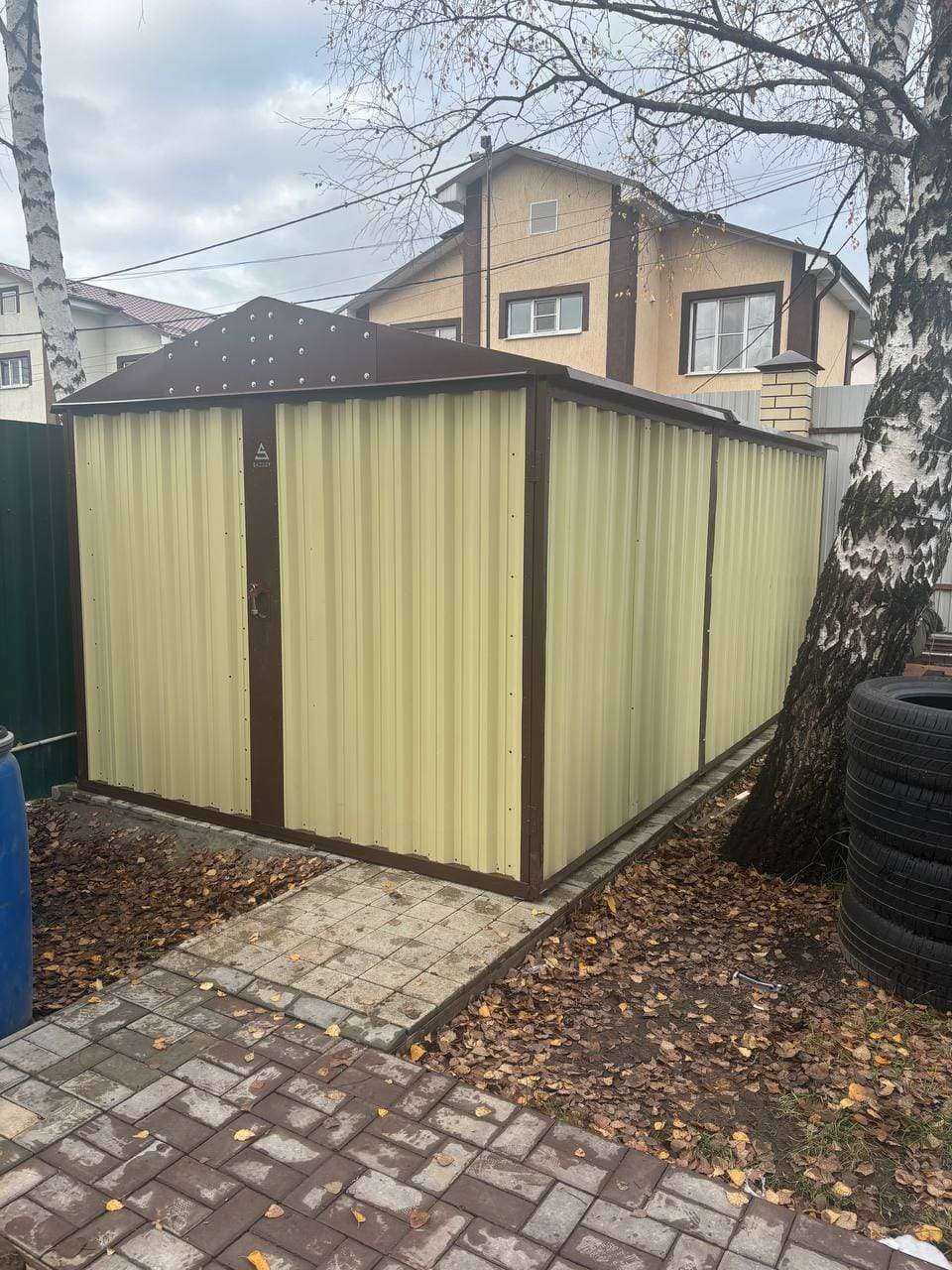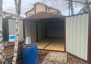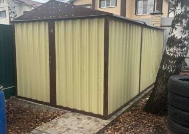 Нами была изготовлена конструкция размером 5,06 х 2,7 х 2,45 м с двускатной крышей и торцевой воротной группой в красивейшем сочетании расцветок RAL 1014 «слоновая кость» для основных элементов и шоколадно-коричневого RAL 8017 для фасонных элементов и крыши.