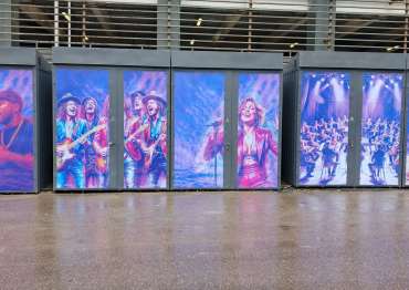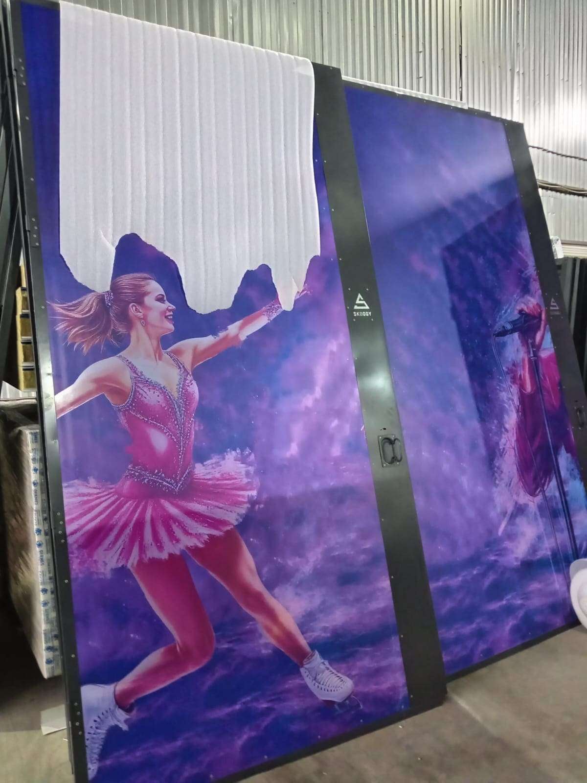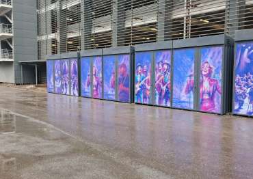 Нами были изготовлены конструкции индивидуальных размеров с односкатными крышами и боковыми воротными группами в строгом графитовом цвете с нанесением ярких и красочных принтов.