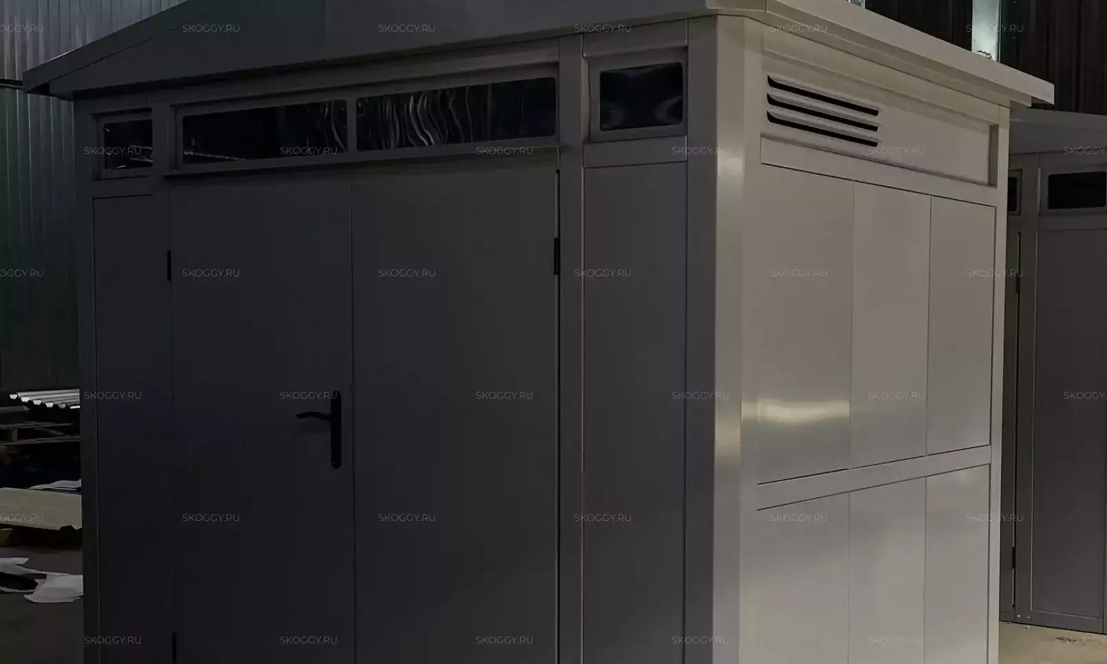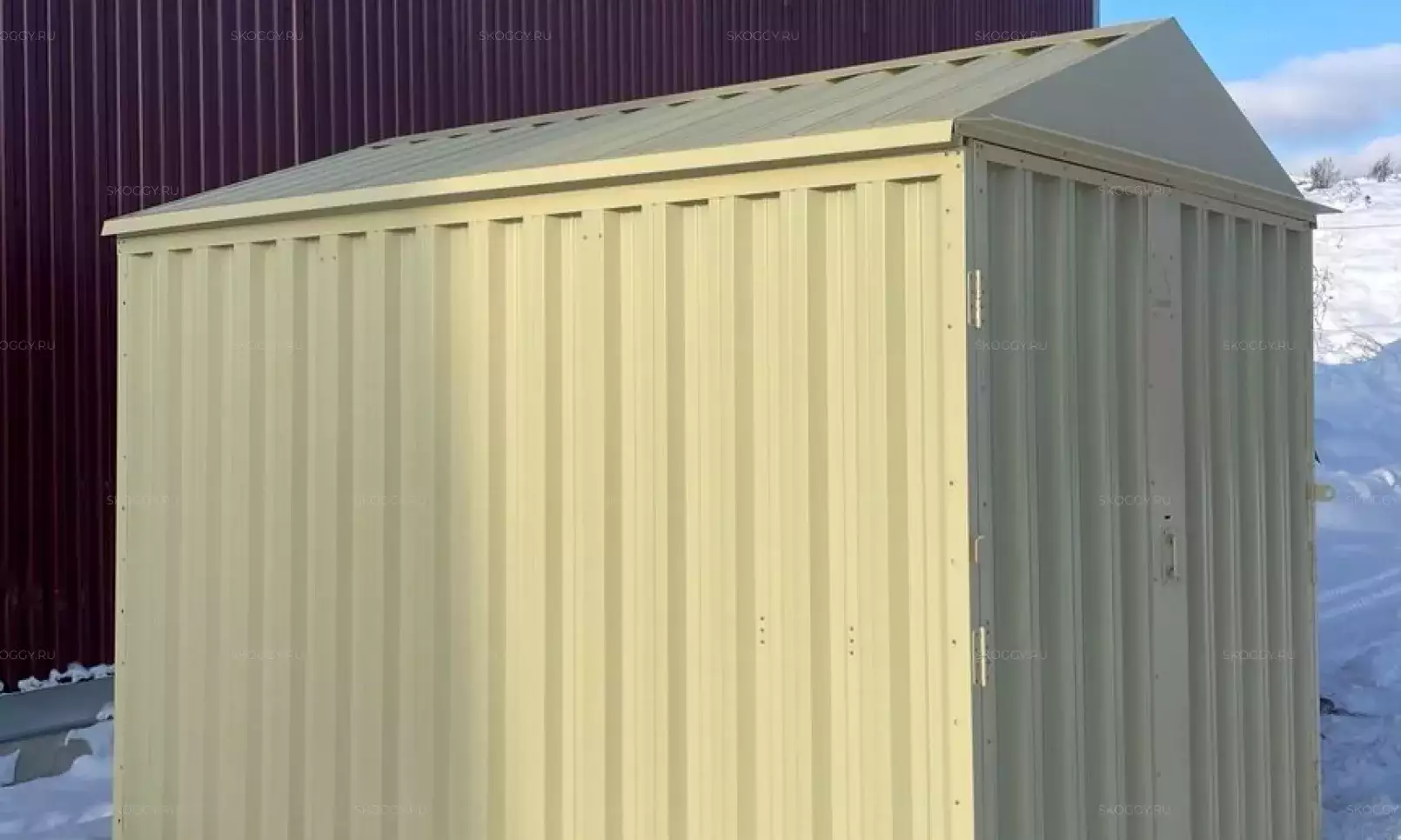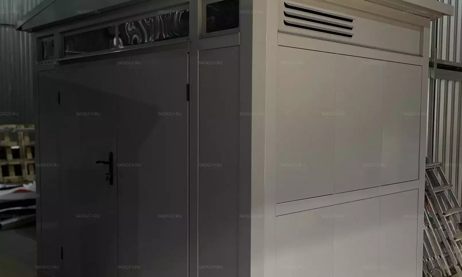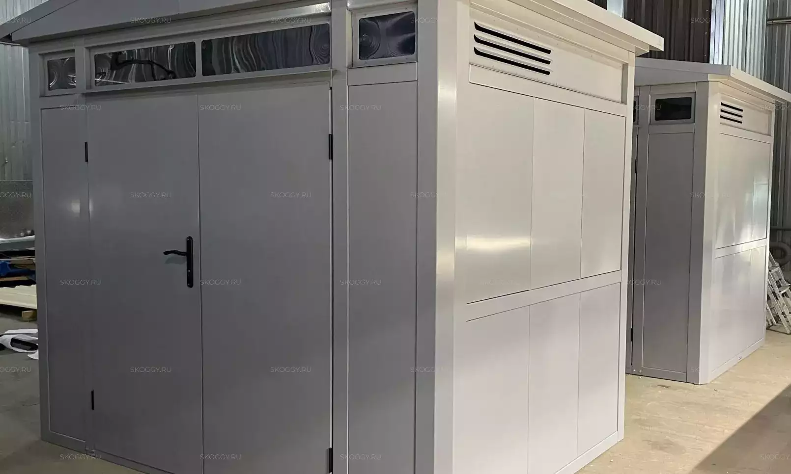 Нами была изготовлена стандартная 2-метровая конструкция с плоской крышей и входной группой с рольставнями в популярном шоколадно-коричневом цвете RAL 8017.