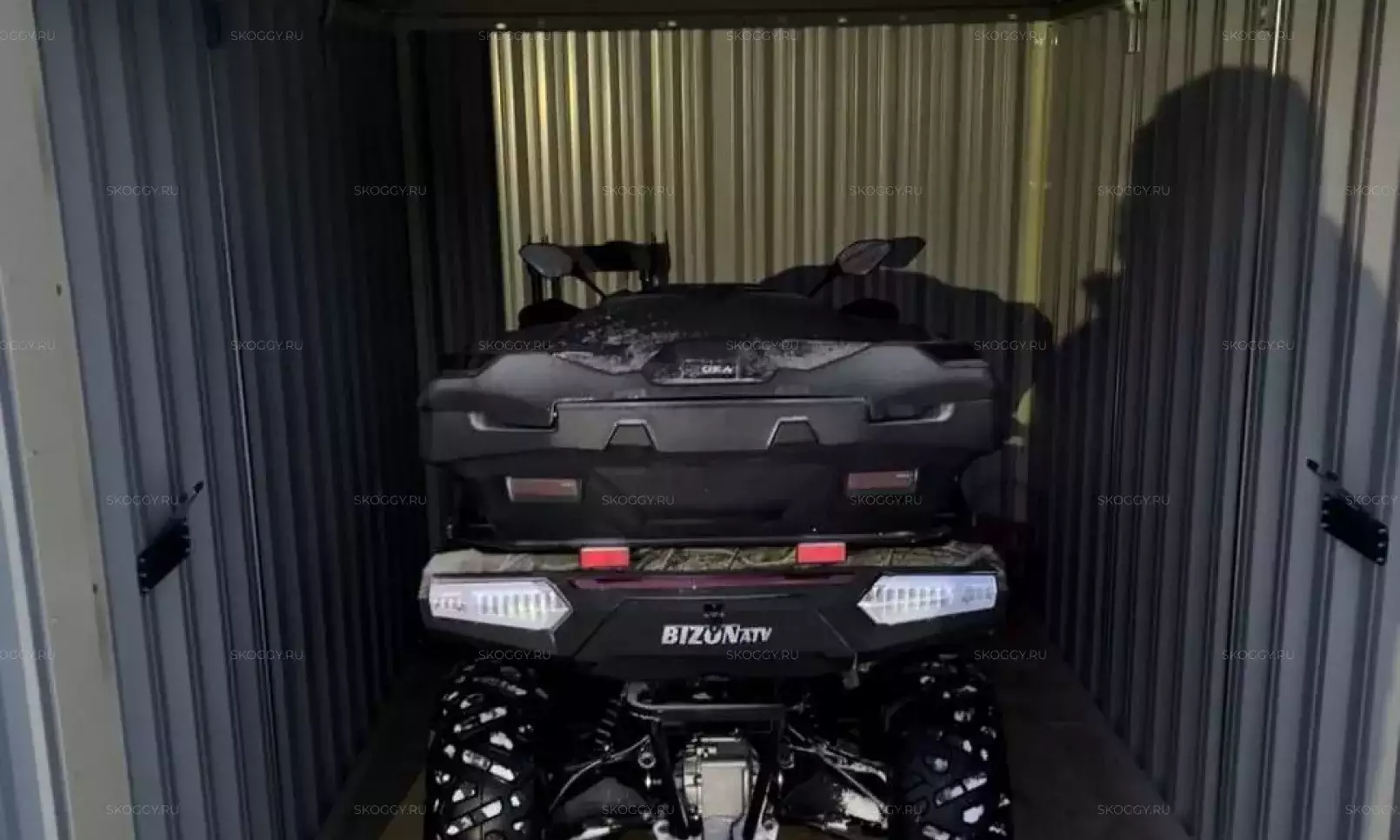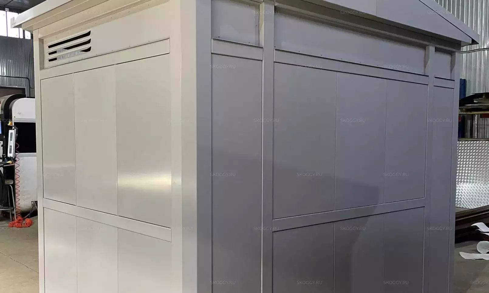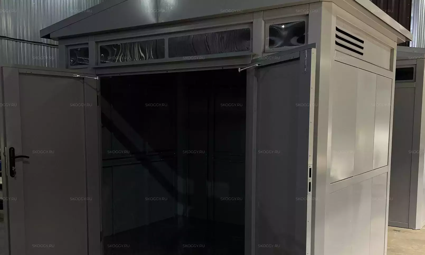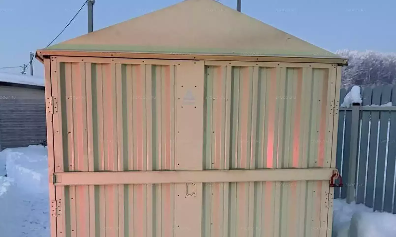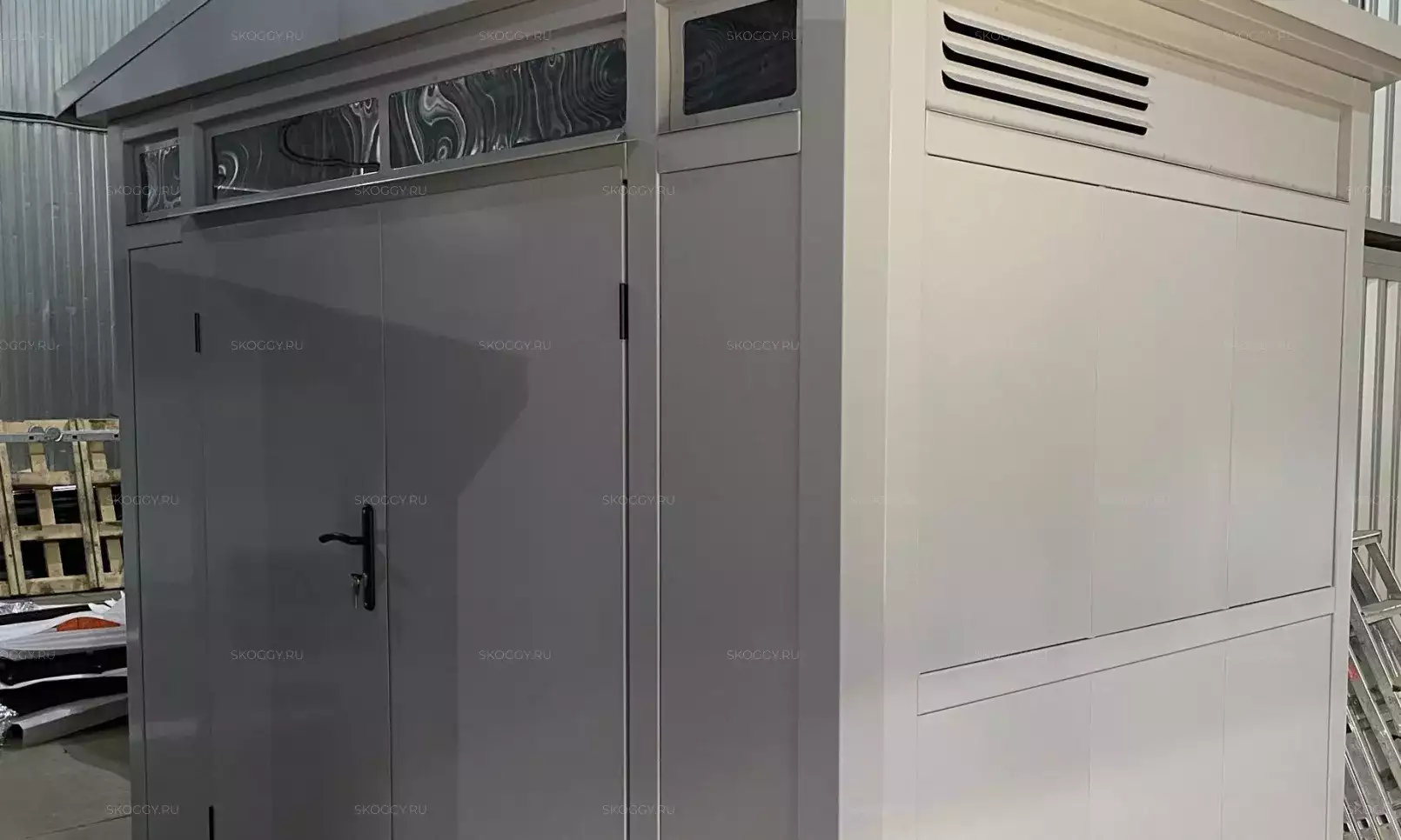 Нами была изготовлена стандартная 2-метровая конструкция с плоской крышей и входной группой с рольставнями в популярном шоколадно-коричневом цвете RAL 8017.