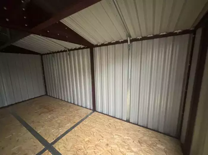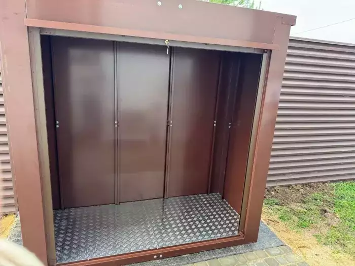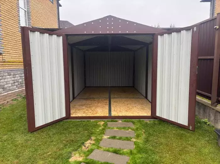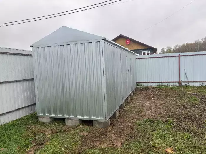Дополнительно хозблок оборудован прямым стеллажом с тремя полками в стандартном цинковом цвете.