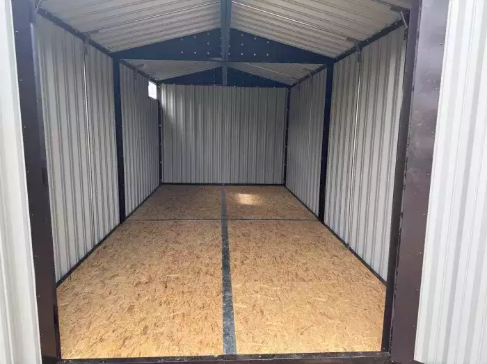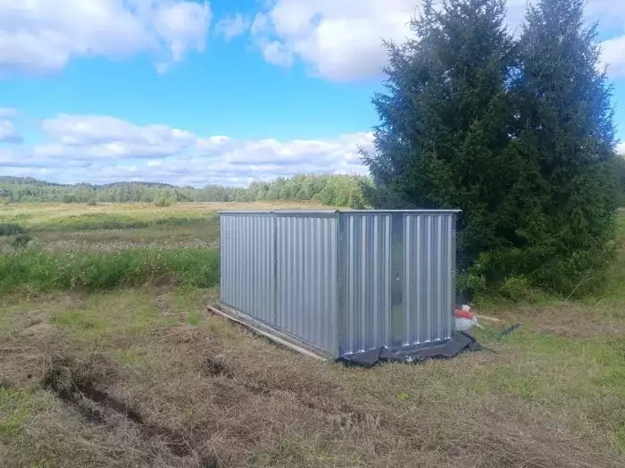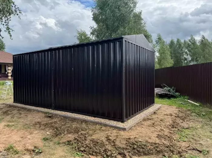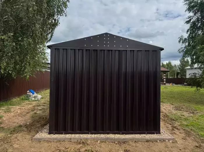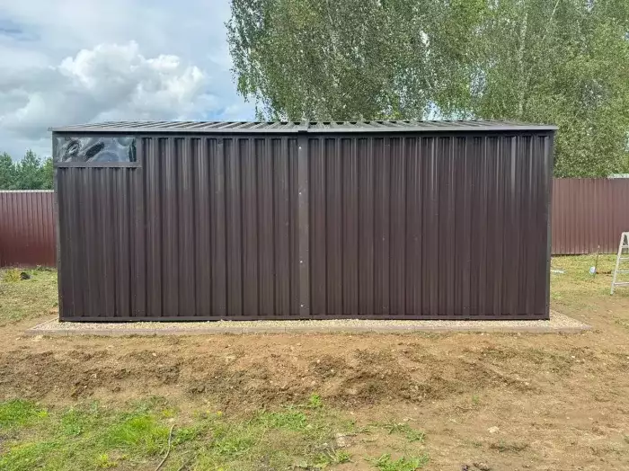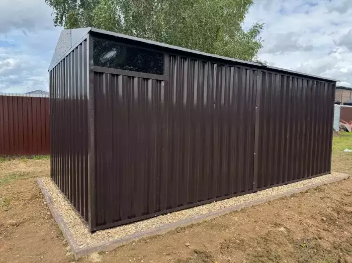 Также в проект включили дополнительную дверь сбоку и укомплектовали системами хранения: прямым и угловым стеллажами, а также инструментальной панелью. Постройка получила один из популярных расцветок – прекрасный шоколадный цвет RAL 8017.