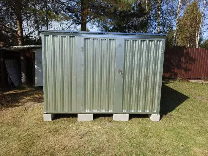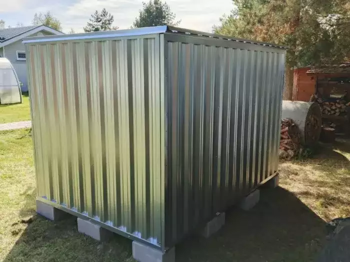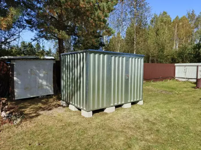 Проект: 5-метровый широкий хозблок для хранения хозяйственных принадлежностей в цинковом цвете.