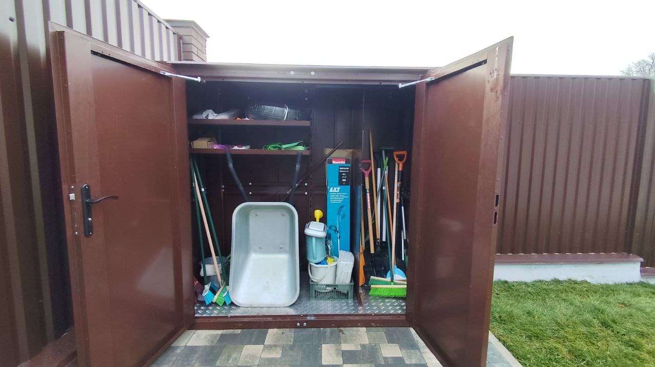 Проект: уличный шкаф 2,03 х 2,022 х 0,88 м для хранения садового инвентаря в шоколадно-коричневом цвете.